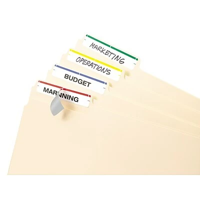 Getting at your files quickly can be a great boon during meetings and presentations. A colored slip on the edge of each label lets you coordinate key document types in your filing cabinet or briefcase.