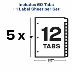 Easily create print shop quality personalized binder dividers with tabs using Avery Index Maker Clear Label Dividers. Customize the title tabs for your dividers quickly and easily using the free templates on the Avery website and print with your inkjet or laser printer for clean, professional looking results in minutes. This pack comes with 5 sets of 12-tab dividers, and the Easy Apply clear label strips make it simple to apply all 12 labels of each set at once. Just print, align labels against tabs, smooth down labels and peel up strip. The white binder dividers feature an assortment of brightly colored tabs for eye-catching convenience when you’re looking for the right section. Each 3-hole punched durable divider also features doubled-sided, reinforced tabs and edges to help resist tearing for long-lasting, everyday use. These 3 ring binder dividers with tabs are a great addition to your medical office supplies, school binders, personal organizers, tax office supplies, presentation reports and more. Print, peel, and press your way to a perfect, precise project.