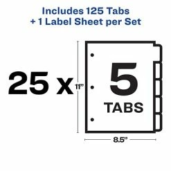 Easily create print shop quality personalized binder dividers with tabs using Avery Index Maker Clear Label Dividers. Customize the title tabs for your dividers quickly and easily using the free templates on the Avery website and print with your inkjet or laser printer for clean, professional looking results in minutes. This pack comes with 25 sets of 5-tab dividers, and the Easy Apply clear label strips make it simple to apply all 5 labels of each set at once. Just print, align labels against tabs, smooth down labels and peel up strip. The white binder dividers feature an assortment of pastel colored tabs for eye-catching convenience when you’re looking for the right section. Each 3-hole punched durable divider also features doubled-sided, reinforced tabs and edges to help resist tearing for long-lasting, everyday use. These 3 ring binder dividers with tabs are a great addition to your medical office supplies, school binders, personal organizers, tax office supplies, presentation reports and more. Print, peel, and press your way to a perfect, precise project.