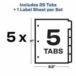 Easily create print shop quality personalized binder dividers with tabs using Avery Index Maker Clear Label Dividers. Customize the title tabs for your dividers quickly and easily using the free templates on the Avery website and print with your inkjet or laser printer for clean, professional looking results in minutes. This pack comes with 5 sets of 5-tab dividers, and the Easy Apply clear label strips make it simple to apply all 5 labels of each set at once. Just print, align labels against tabs, smooth down labels and peel up strip. The white binder dividers feature an assortment of pastel colored tabs for eye-catching convenience when you’re looking for the right section. Each 3-hole punched durable divider also features doubled-sided, reinforced tabs and edges to help resist tearing for long-lasting, everyday use. These 3 ring binder dividers with tabs are a great addition to your medical office supplies, school binders, personal organizers, tax office supplies, presentation reports and more. Print, peel, and press your way to a perfect, precise project.