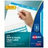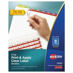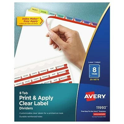 Easily create print shop quality personalized binder dividers with tabs using Avery Index Maker Clear Label Dividers. Customize the title tabs for your dividers quickly and easily using the free templates on the Avery website and print with your inkjet or laser printer for clean, professional looking results in minutes. This pack comes with 25 sets of 8-tab dividers, and the Easy Apply clear label strips make it simple to apply all 8 labels of each set at once. Just print, align labels against tabs, smooth down labels and peel up strip. The white binder dividers feature an assortment of pastel colored tabs for eye-catching convenience when you’re looking for the right section. Each 3-hole punched durable divider also features doubled-sided, reinforced tabs and edges to help resist tearing for long-lasting, everyday use. These 3 ring binder dividers with tabs are a great addition to your medical office supplies, school binders, personal organizers, tax office supplies, presentation reports and more. Print, peel, and press your way to a perfect, precise project.