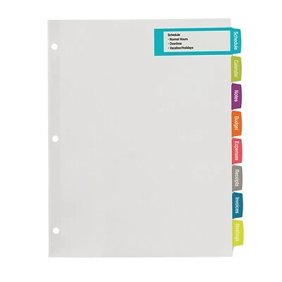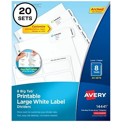 Large labels extend from the tabs onto each divider body – more room to fit content, logos or graphics on your tab labels. Easy Peel(R) labels with the Pop-up Edge(R) for fast, easy tab labeling – no inserts needed. Arched shaped tabs and labels give a contemporary look. Print in black & white or create a custom color set with print-to-the-edge labels. Easy to customize with free templates and designs using Avery Design & Print (avery.com/print). Reinforced holes and tabs for extra durability. Bonus standard label sheet included for labeling back of tabs – allows for quick referencing.