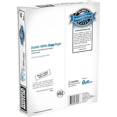 Dunder Mifflin Premium copy paper measures 8 1/2″ x 11″ and is great for copiers, inkjet as well as laser printers. Acid free copy paper features poly-wrapped reams that provides visual appeal and protective strength.
