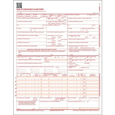 Use these easy-to-read insurance claim forms for a faster claims process. Printed in scannable, dropout OCR red ink, these documents deliver crisp, clean text and comply with CMS standards and requirements for paper, layout and ink to expedite the receipt of payment for health care facilities. These ComplyRight CMS-1500 forms include 02/12 NUCC revisions and replace the previous 08/05 version.