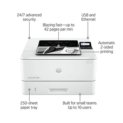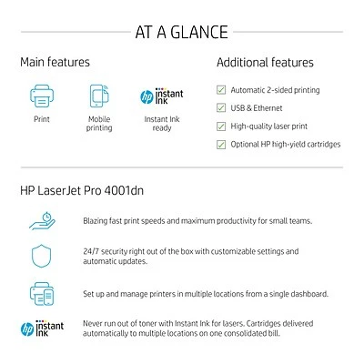 Get ultra-fast speeds and powerful productivity with the LaserJet Pro 4001dn. Get laser quality black & white printing for all your business documents. Set up and manage printers in multiple locations with a single dashboard. Never run out of toner with an optional subscription for Instant Ink for lasers.