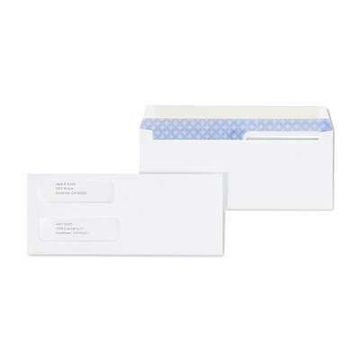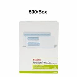 Mail employees, contractors and vendors checks using these Staples envelopes. The security tint and double-window design make these envelopes perfect for confidential mailings, and the gummed flap keeps contents secure during transit to the recipient. Each box provides an ample amount for your mailing cycle, making it simple to stay stocked.