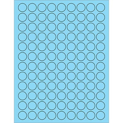 3/4″ Fluorescent Pastel Blue Circle Laser Labels. Use to create your own product or mailing labels. Labels work with both laser and ink jet printers. Permanent adhesive. Labels stick to a variety of smooth surfaces including paper, corrugated, plastic, wood, glass and metal.