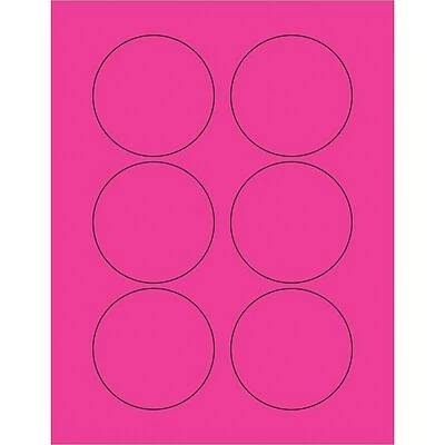 3″ Fluorescent Pink Circle Laser Labels. Use to create your own product or mailing labels. Labels work with both laser and ink jet printers. Permanent adhesive. Labels stick to a variety of smooth surfaces including paper, corrugated, plastic, wood, glass and metal.