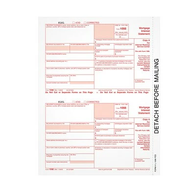 Satisfy IRS Tax requirements with TOPS 1098 Mortgage Interest Statements – Federal Copy A cut sheet forms – 2 forms/sheet. Laser/inkjet printer compatible. Size: 8-1/2″ x 11″. Printed in scannable red ink.
